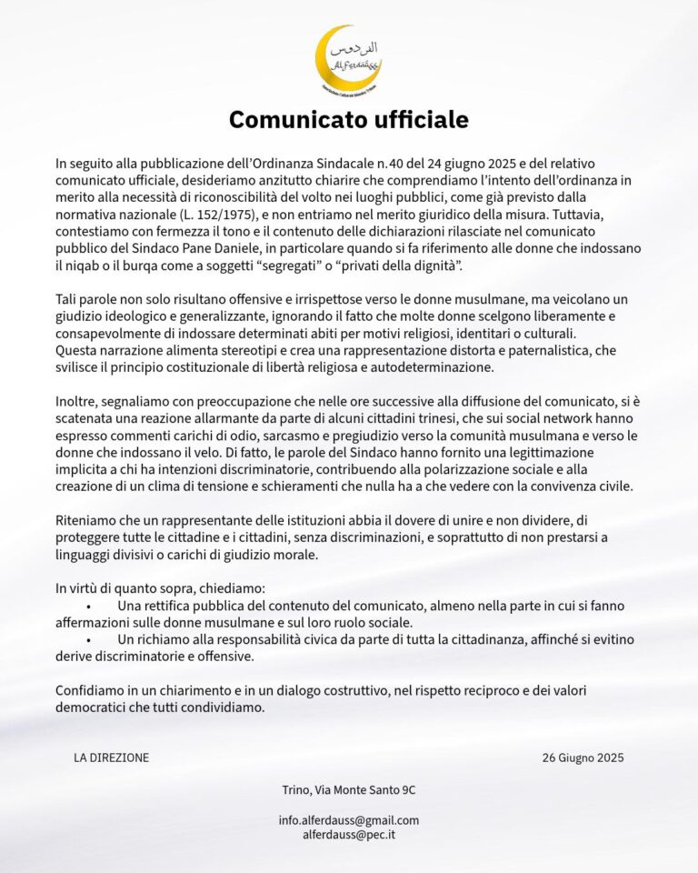 La replica di Al Ferdauss sull’ordinanza del sindaco