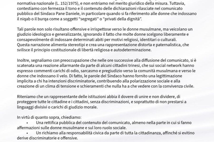 A maggior ragione, questa puntualizzazione risulta necessaria in un contesto come il nostro, dove esiste da molti anni una comunità musulmana presente, radicata e consapevole delle regole del vivere comune, che ha sempre dimostrato di conoscere e rispettare le norme. Si tratta di una comunità con cui l’Amministrazione ha collaborato concretamente negli anni per promuovere percorsi di dialogo, partecipazione e inclusione.